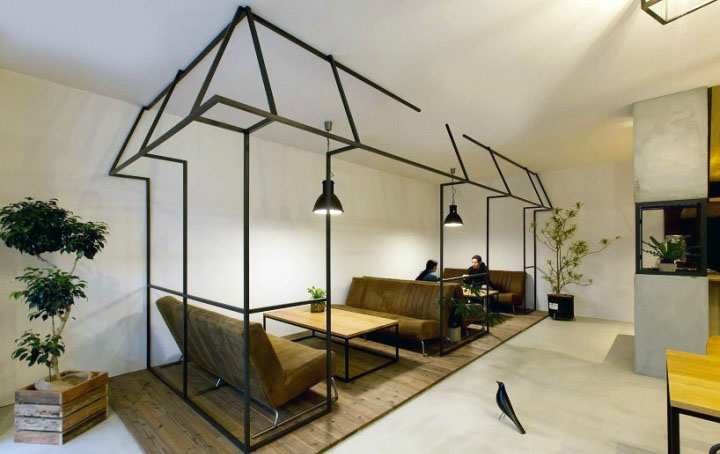 黑色金屬框做成了屋檐的造型,選一盞黑色吊燈,配一只可愛小鳥!