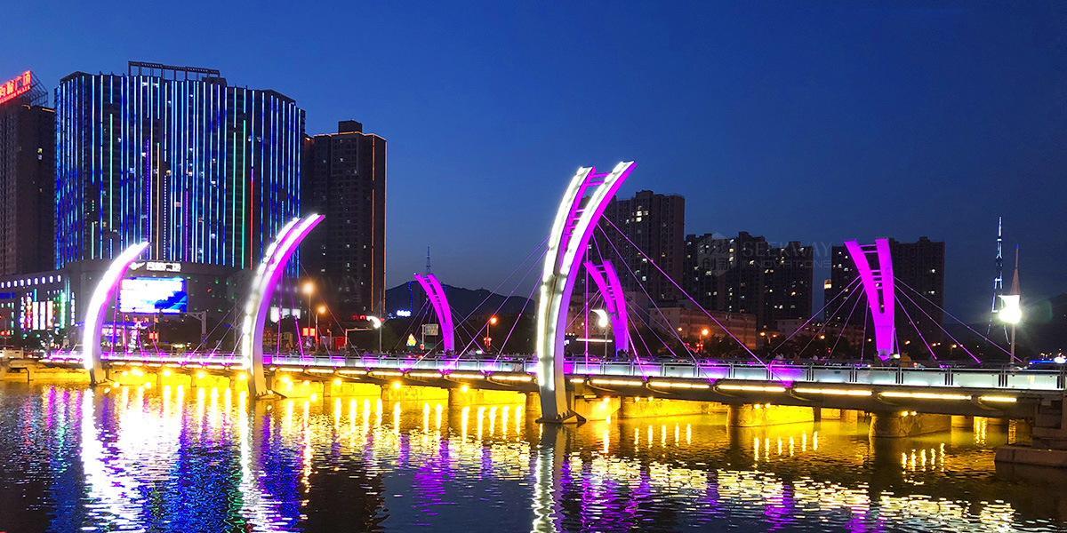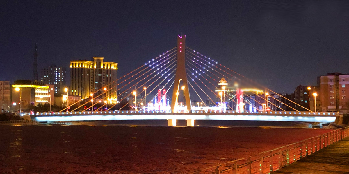 張家口清水河-建設橋-解放橋-商務橋,工業照明案例,戶外RGB電源案例,建設橋 建設橋設計以“騰飛”為主題,橋塔的設計獨具匠心,整個橋塔由底部旋轉上升,造型簡潔,設計感強。建成后的大橋像一條龍踏云飛騰,給人以強烈的視覺沖擊力,讓市民領略到“波引目光依兩岸、霞分曉日浸山河”的視覺美景。 解放橋是張家口現在比較老的橋。每到夜色,解放橋五光十色,非常