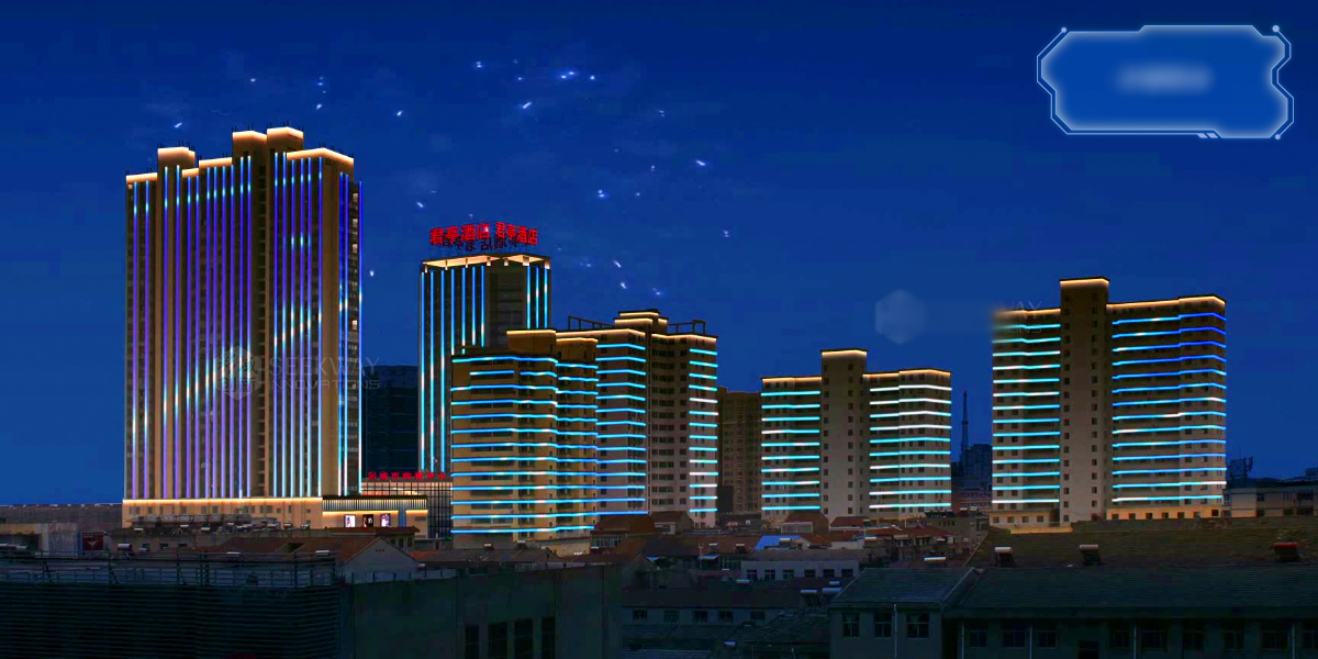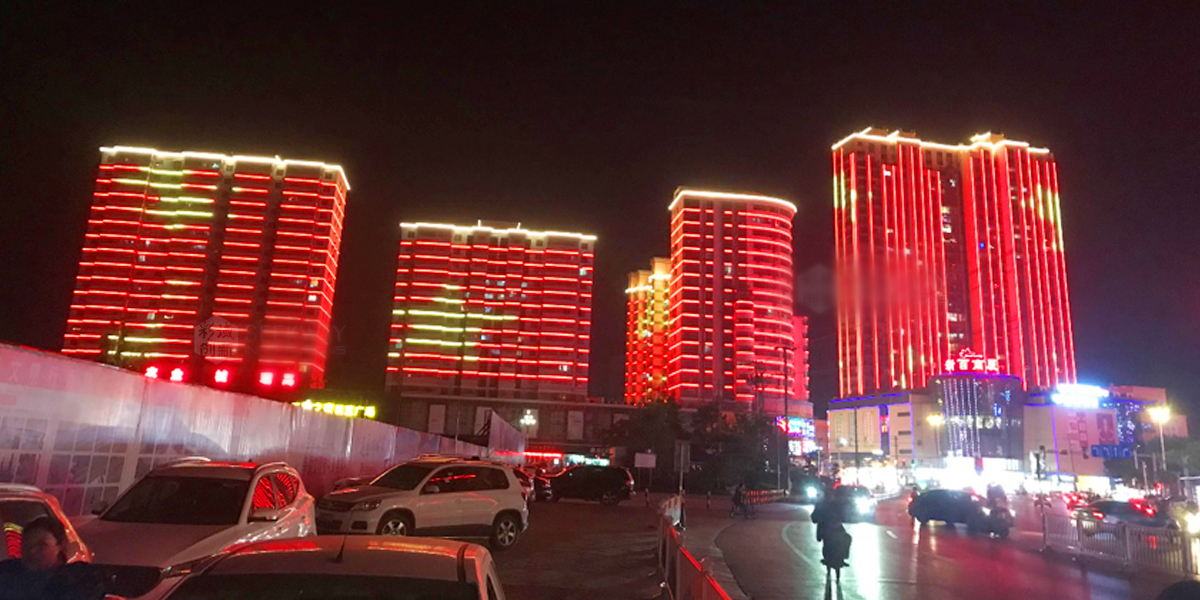 項目介紹 · 項目: 安徽蕭縣城市中心亮化工程 · 時間: 2019年 · 地點: 安徽蕭縣 · 燈具: SM16512線條燈、SM16512投光燈 · 控制硬件: 7臺MP210+80臺EN-508 · 功能介紹: 7棟樓同步聯動