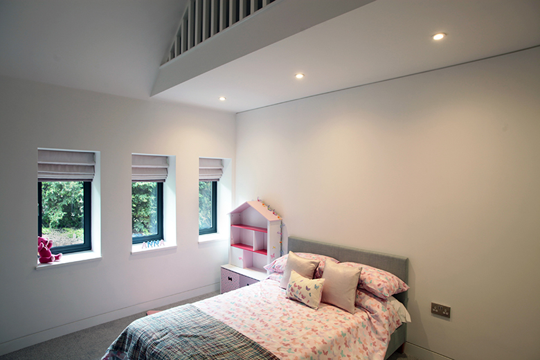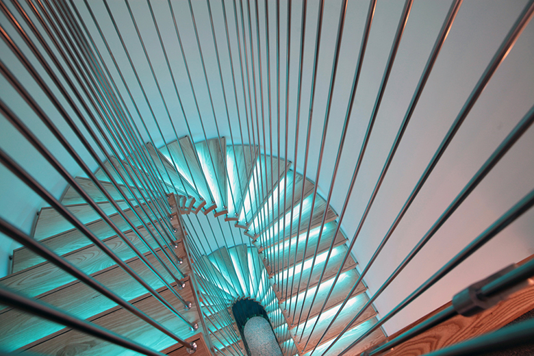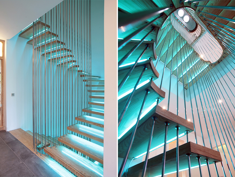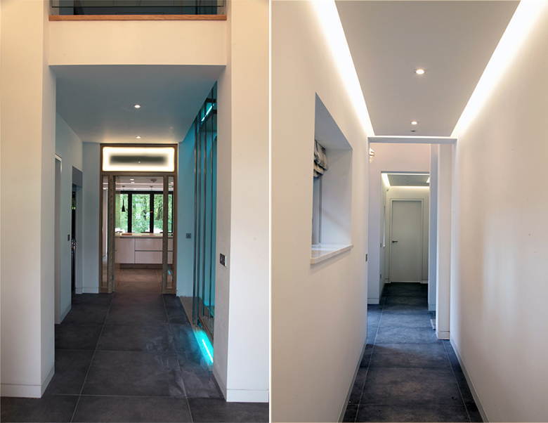 樓梯、走廊區(qū)域,通過LED燈帶嵌入樓梯踏步板之下和走廊的天花里面,打造“見關(guān)不見燈”的視覺效果,讓我們仿佛走在一條時(shí)空隧道中。在金駒DMX解碼器控制下,無頻閃的調(diào)光效果呵護(hù)著家人眼睛的健康。