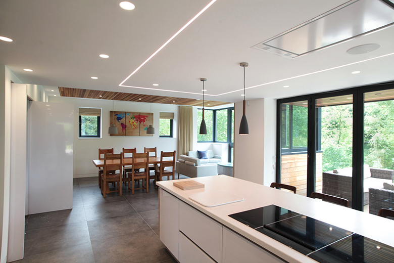 廚房為開放式布局,需要無陰影的常規(guī)照明,既要實(shí)用、美觀,同時(shí)明亮、清新,給人整潔的感覺。
