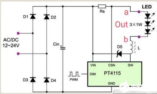上圖是采用PT4115恒流驅動IC構成的恒流驅動電路,所要驅動的LED燈珠接在Out端(即a、b兩點之間)。正常工作時,不論Out端接一個LED燈珠還是三個LED燈珠,流過燈珠的電流都是恒定不變的,即使電源電壓在一定范圍內變化,流過燈珠的電流仍為恒定的,但是這種LED驅動電路的輸出電壓會隨著LED燈珠的數量而變化,假設驅動一個白光LED燈珠,此時Out端電壓在3V左右;若驅動三個串聯的白光LED燈珠,則Out端的電壓可達9V。若Out端為空載(即a、b兩點之間不接LED燈珠),此時Out端的輸出電壓可以接近PT4115的供電電壓。