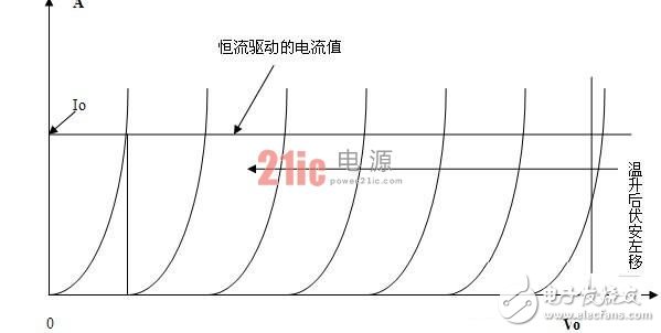 在常溫下是可以的,但在溫升以后就不能保持了。圖6中就顯示了這個問題,常溫下的LED伏安特性以實線表示,兩個LED的伏安特性在斜率上略有區別,在用恒壓電源Vo供電時,選用不同的電阻,可以得到同樣的正向電流Io。但是當溫度升高時,其伏安特性左移,如虛線所示。因為還是原來的恒壓和原來的電阻,此時的電流卻變成了I1和I2。不等于原來的Io了。