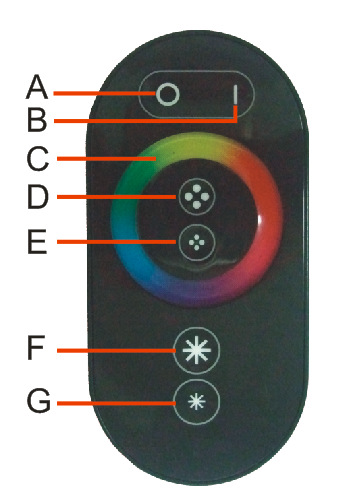F.配對對碼功能鍵,在打開控制器電源前按住此鍵后打開控制器的電源,長按此鍵3秒,配對 成功時,控制.器會連閃3次,表示配對成功; 解除配對,同樣在打開控制器電源前按住此鍵 后打開控制器的電源,長按此鍵3秒,當控制器連閃6次時,表示己解除配對.在開機后, 是 亮度與速率調整鍵(調大).