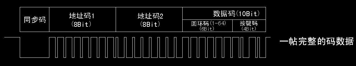 一幀完整的數據包含以下信息:同步碼+地址碼1(1字節(jié)=8bit)+地址碼2(1字節(jié)=8bit)+數據碼(10bit)(彩環(huán)數據為前6bit,后4bit為按鍵數據) (無檢驗碼)。