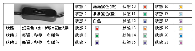 1,通過電源開關(guān)切換顏色,開機3-10秒之間開關(guān)一次就從當(dāng)前狀態(tài)轉(zhuǎn)換到下一狀態(tài),從狀態(tài)2到狀態(tài)21一直循環(huán)。開機0-3秒之間按開關(guān)一次就復(fù)位,復(fù)位至狀態(tài)2(1秒跳變)模式。