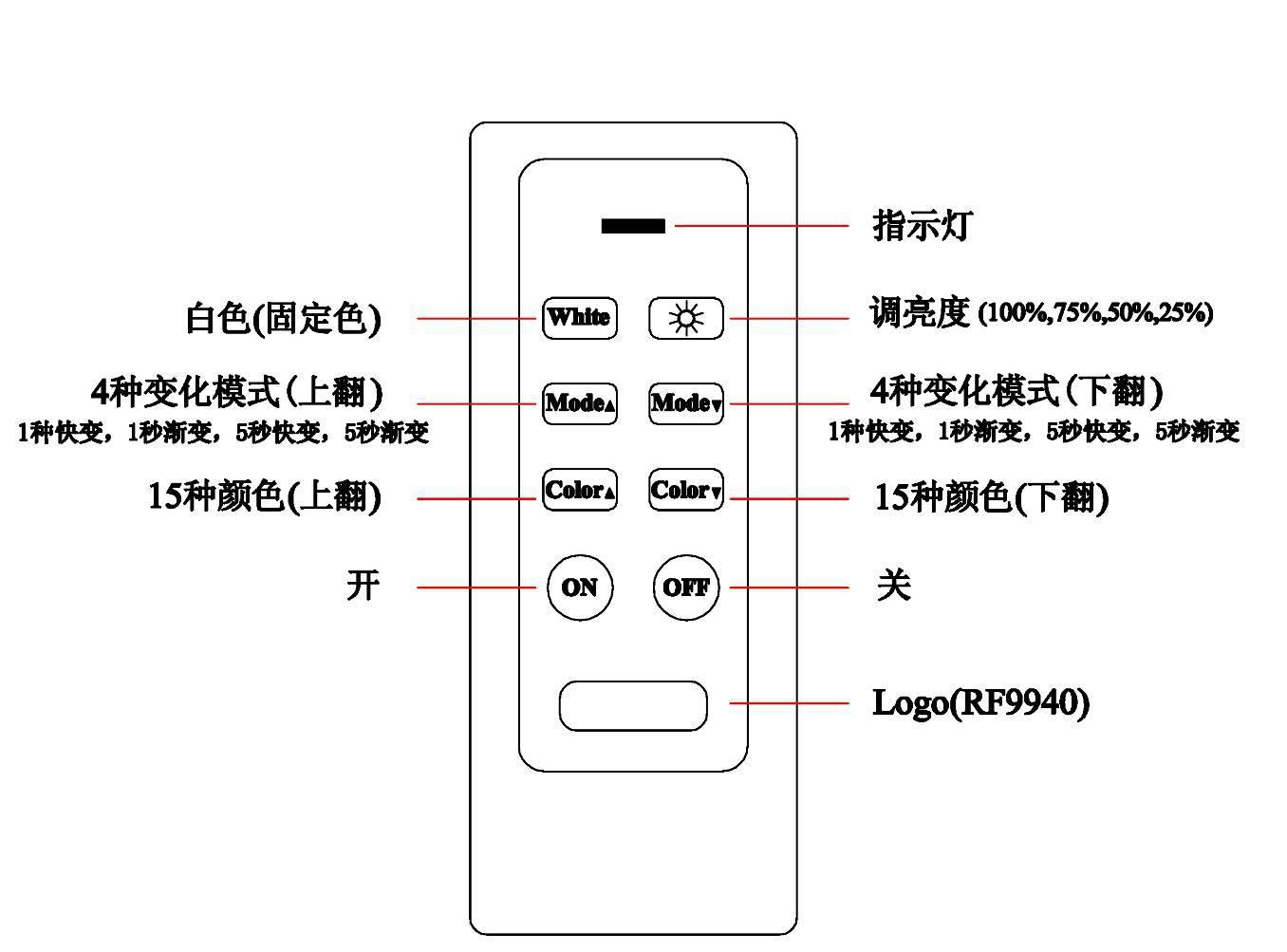 變色燈具有16種發(fā)光顏色,分別為:白、紅、綠、蘭、洋紅、草綠、淺藍、橙色、淺綠、