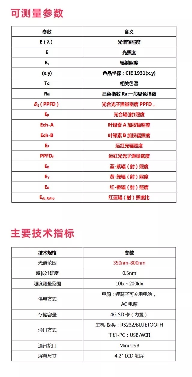PLA-20除能測(cè)量一般的光照度、輻射照度、色品坐標(biāo)、色溫、顯色指數(shù)等參數(shù)外,還可準(zhǔn)確獲得光合光子通量密度、光合輻(射)照度、葉綠素A/B加權(quán)輻照度、遠(yuǎn)紅光輻照度等參數(shù)。