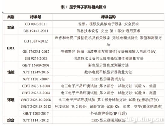 顯示屏子系統(tǒng)的相關(guān)標(biāo)準(zhǔn)見表2,可以分為安全標(biāo)準(zhǔn)、電磁兼容標(biāo)準(zhǔn)、性能標(biāo)準(zhǔn)(主要針對顏色)、環(huán)境標(biāo)準(zhǔn)(包括防水、防塵,高低溫,振動,跌落和鹽霧等)和綜合標(biāo)準(zhǔn)。目前,缺乏標(biāo)準(zhǔn)對智慧路燈用顯示屏的尺寸和最大亮度等進行規(guī)范。