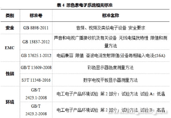 黑色家電,大多指彩電、音響、照相機這類可以為人們提供娛樂生活的產(chǎn)品。黑色家電交互數(shù)據(jù)量大,需要高速的通信協(xié)議,一般采用WiFi。由于產(chǎn)品種類不同,適用標(biāo)準(zhǔn)略有不同,本小節(jié)以電視機為例,梳理了黑色家電的相關(guān)標(biāo)準(zhǔn),見表4: