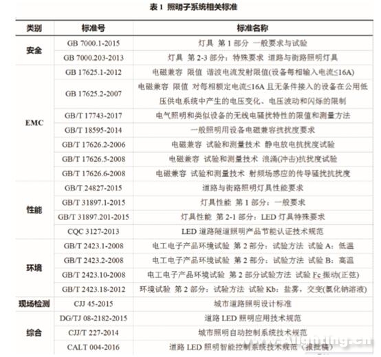 照明子系統(tǒng)的相關(guān)標(biāo)準(zhǔn)見表1,可以分為安全標(biāo)準(zhǔn)、電磁兼容標(biāo)準(zhǔn)、性能標(biāo)準(zhǔn)(主要考核LED路燈的光學(xué)性能和燈具效能等)、環(huán)境標(biāo)準(zhǔn)、現(xiàn)場檢測(對道路的平均亮度、亮度總均勻度、亮度縱向均勻度、平均照度、照度均勻度、眩光、環(huán)境比以及功率密度等提出要求)和綜合標(biāo)準(zhǔn)。
