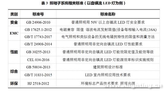 用于家居智能照明的產(chǎn)品有很多,如LED球泡燈、雙端LED燈、LED反射燈、筒燈、面板燈和吸頂燈等,由于適用標(biāo)準(zhǔn)略有不同,表3以自鎮(zhèn)流LED燈為例,整理了智能家居照明子系統(tǒng)的相關(guān)標(biāo)準(zhǔn)。