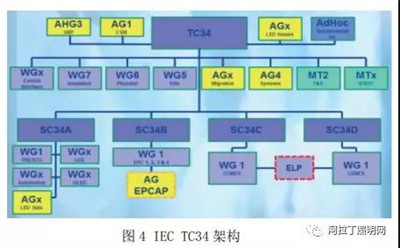 國際上,IEC/TC34燈和相關(guān)器件技術(shù)委員在原有的SC34A(燈)、SC 34B(燈頭&燈座)、SC 34C(附件)、SC 34D(燈具)的 4 個分委會的大框架下,新增AG4 Lighting systems(智慧照明工作組),專門開展智慧照明標(biāo)準(zhǔn)化相關(guān)工作,如圖4所示。