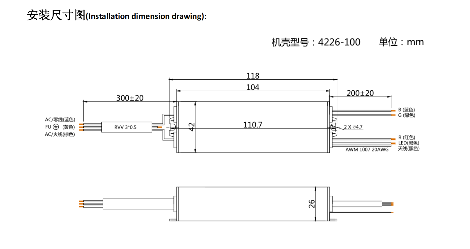 采用LED專用防水環氧樹脂AB膠,通過導熱膠與鋁殼接觸,散熱效果極佳,滿負載輸出時外殼表面溫度不超過65℃(在環境25℃測量) ,室內戶外均可使用,兩端各設兩個機械固定孔位,適用于多種內部安裝應用。