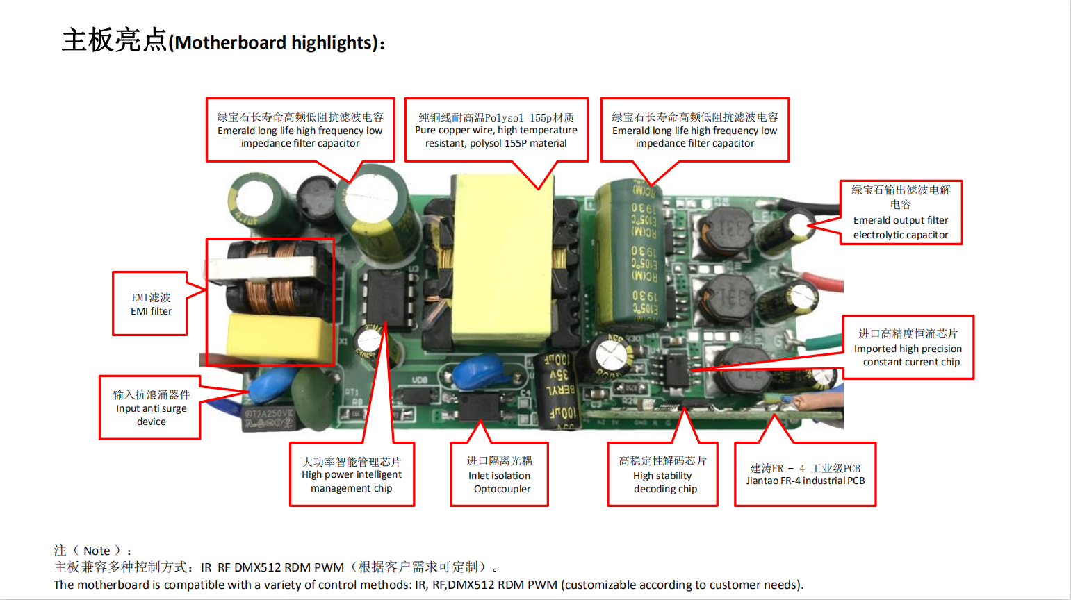 本產品采用集成電路設計方案,輸出采用芯片恒流。具有超高的恒流精準度,及線路板合理的布局,使產品在工作中溫升大大降低,從而提高產品的穩定性能。