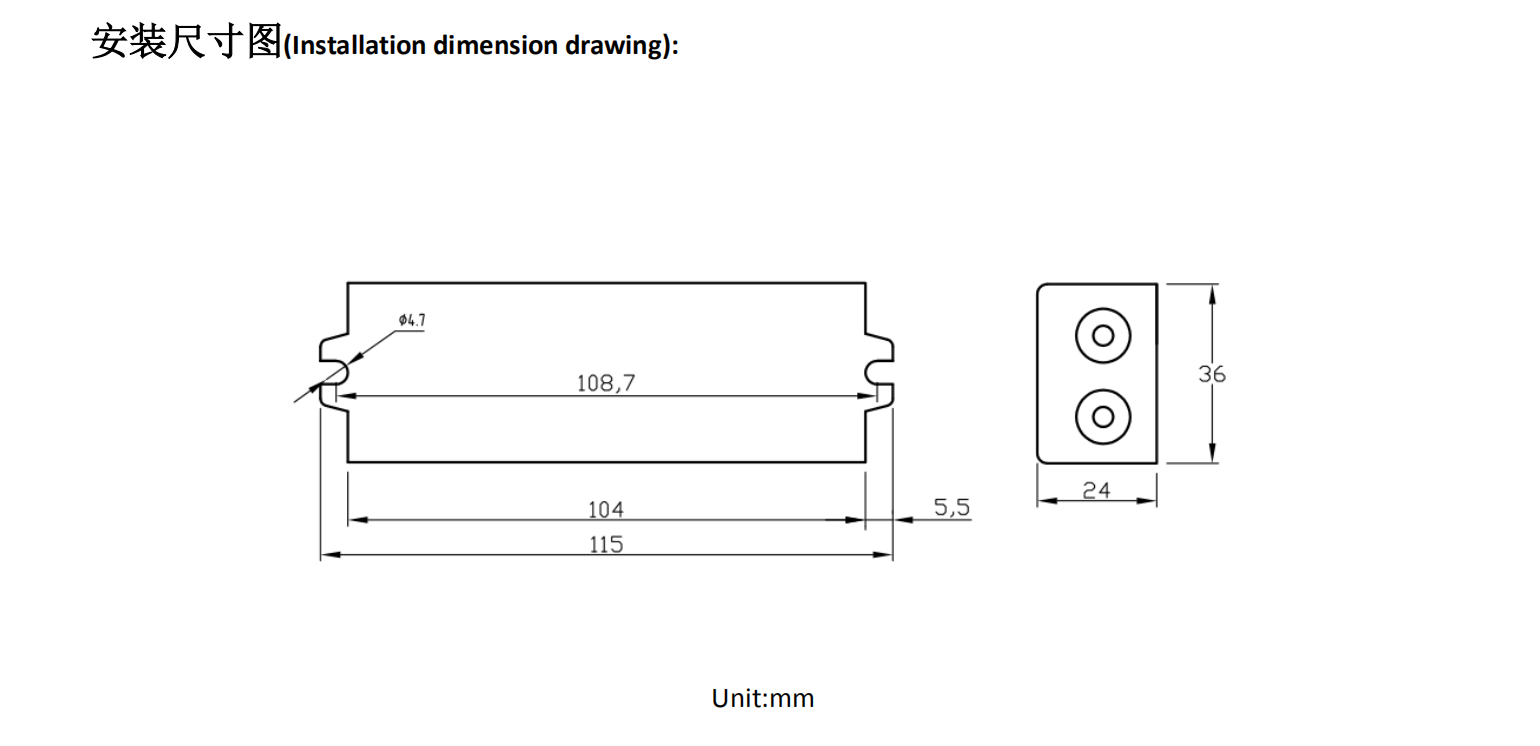 •采用LED專用防水環(huán)氧樹脂AB膠,通過導熱膠與鋁殼接觸,散熱效果極佳,滿負載輸出時外殼表面溫度不超過65℃(在環(huán)境25℃測量) ,室內戶外均可使用,兩端各設兩個機械固定孔位,適用于多種內部安裝應用。